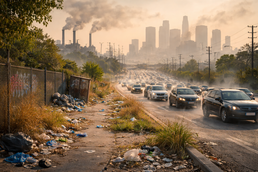 Anxiety and chronic stress symptoms often feel higher in Americans living in environmentally degraded urban neighborhoods—places with heavy traffic pollution, industrial emissions, noise, heat, limited trees, and fewer safe green spaces.